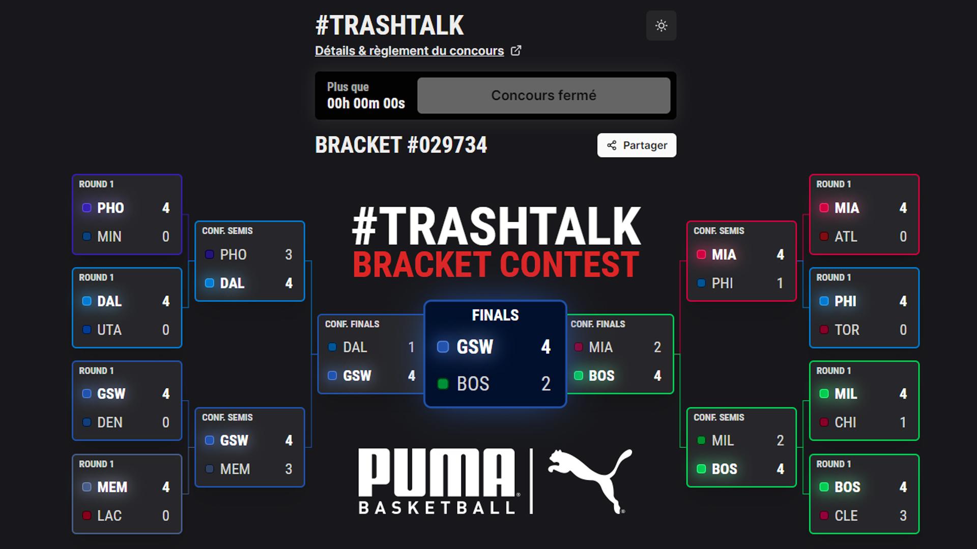 Cette année, nous avions mis les petits plats dans les grands pour vous offrir la meilleure expérience de jeu possible. Le principe ? Lui restait toujours le même : lire l’avenir et remplir son bracket avant le début du play-in tournament ! Un rendez-vous incontournable pour bien préparer les Playoffs NBA et un défi immense pour des milliers de joueuses et de joueurs. Nous voulions voir si vous étiez capables d’annoncer le champion NBA, les finalistes, les scores de toutes les séries, du premier au dernier round… et les qualifiés du play-in tournament. Deux mois et 93 matchs plus tard, il ne pouvait en rester qu’un…