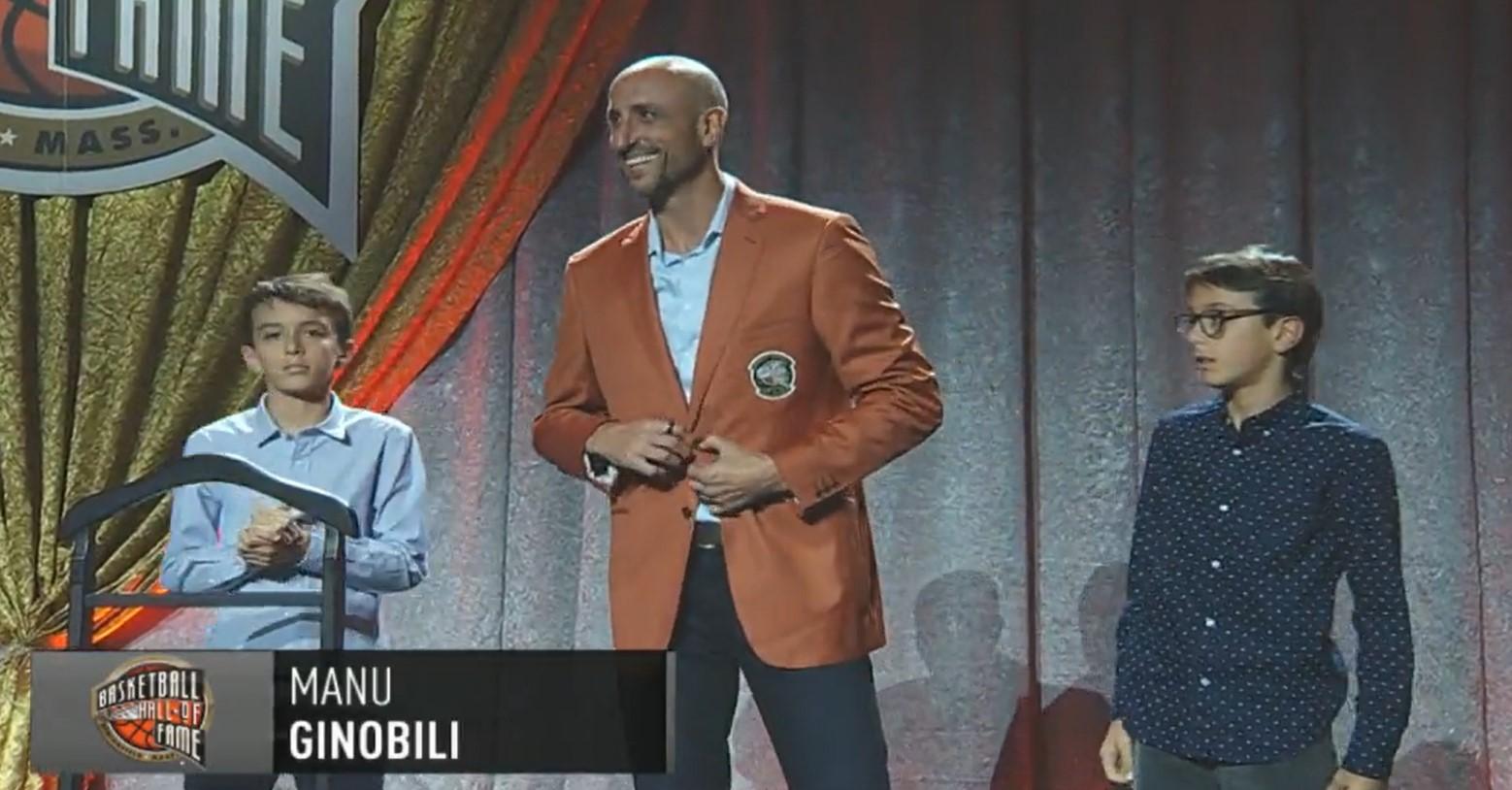 Manu Ginobili was made to wear the @Hoophall jacket 🙌@manuginobili | #NBAHOF