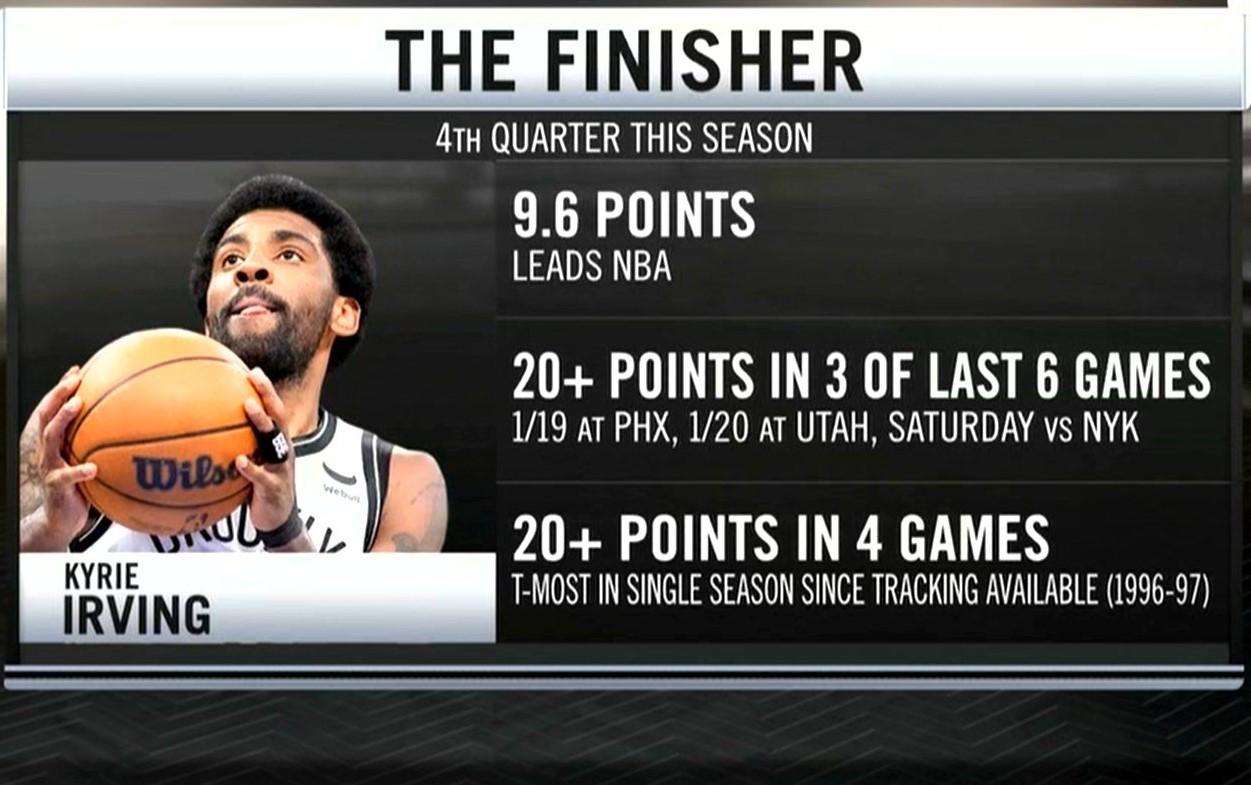 En l’espace de dix jours, Kyrie Irving a donc atteint la vingtaine de points dans l’ultime période à trois reprises. Il avait réussi une prouesse similaire plus tôt dans la saison, le 24 octobre dernier à Memphis (21 points également), ce qui porte donc son total à quatre. C’est tout simplement un record sur une saison depuis la campagne 1996-97 (les points par quart-temps n’étaient pas comptabilisés avant), à égalité avec Trae Young, Kemba Walker et Isaiah Thomas. Sachant qu’il reste une bonne trentaine de matchs à jouer cette année, quelque chose nous dit qu’Uncle Drew pourrait bien mettre la barre encore plus haut, lui qui est aujourd’hui le meilleur marqueur NBA dans les derniers quart-temps (9,5 points par match).
