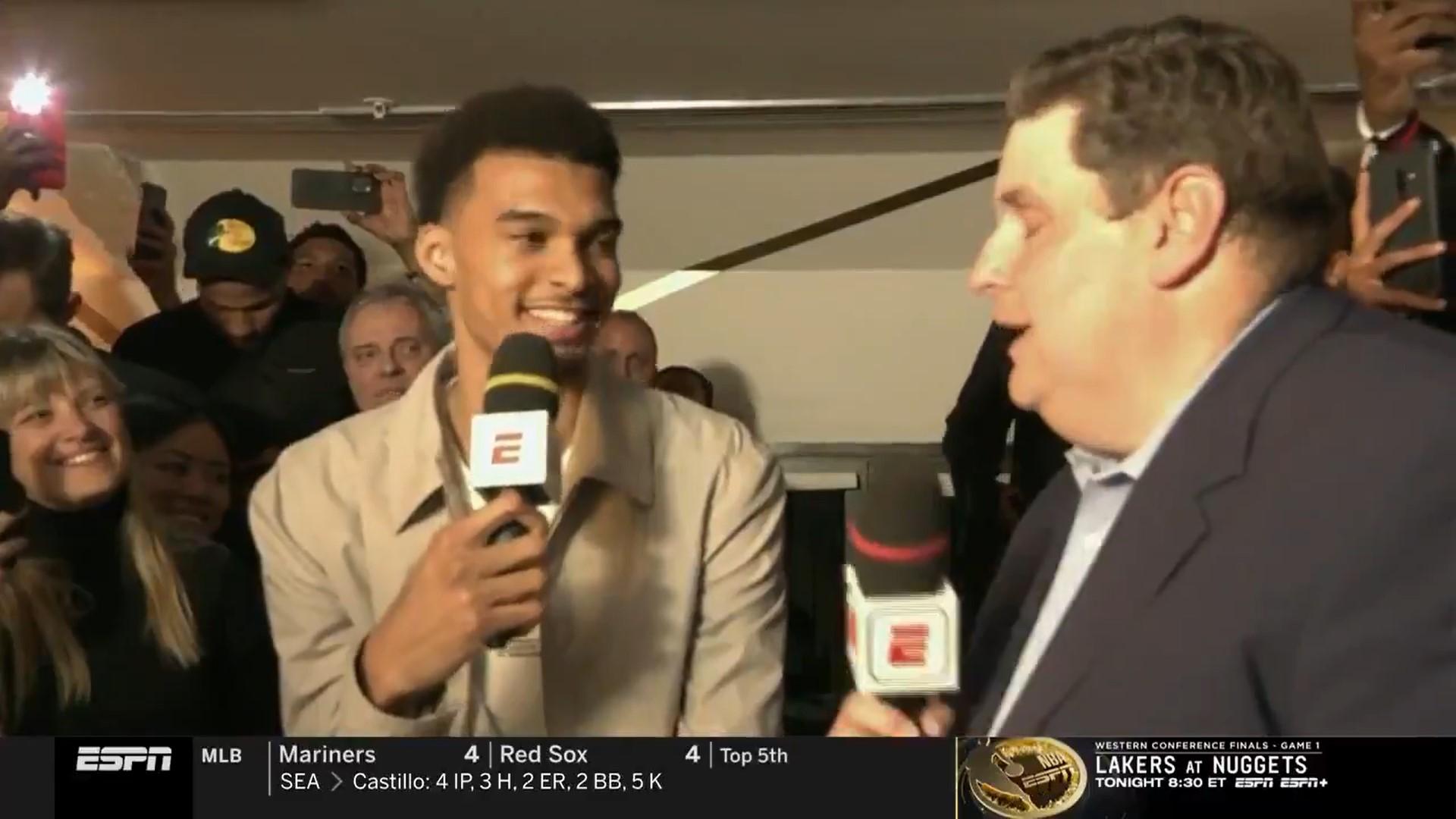 Il est 2h30 du matin au QG de Victor Wembanyama. Le phénomène français vient d’apprendre les résultats tant attendus de la Loterie, finalement remportée par les Spurs. Le journaliste d’ESPN Brian Windhorst, en déplacement à Paris pour l’occasion, réalise la première interview de Wemby. Elle dure à peine 70 secondes, mais ça suffit à Victor pour partager ses (grands) objectifs.