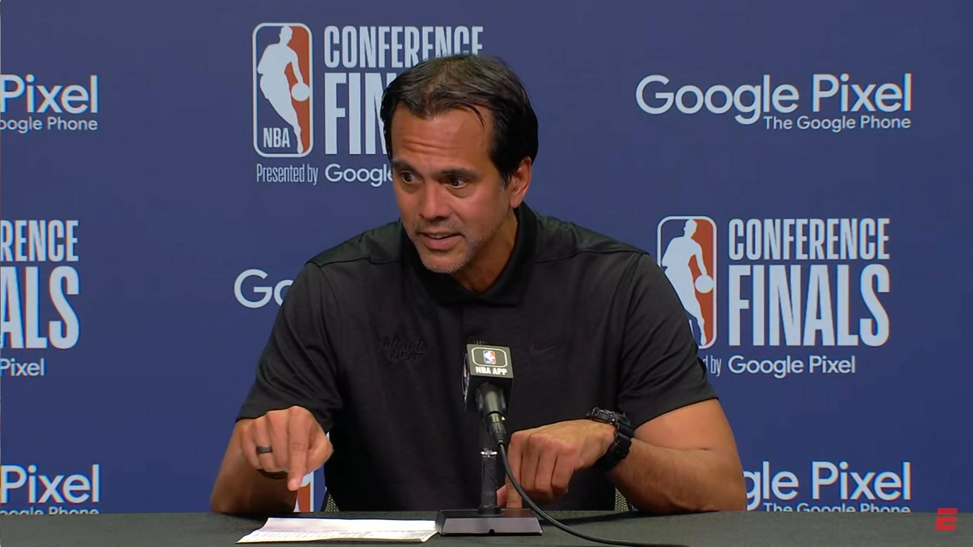 Le coach du Heat Erik Spoelstra veut s’assurer que son équipe ne craquera pas lors du Game 7 à venir lundi. Alors dès le début de sa conférence de presse d’après-match cette nuit, il a tenu à dire les termes avec autorité.