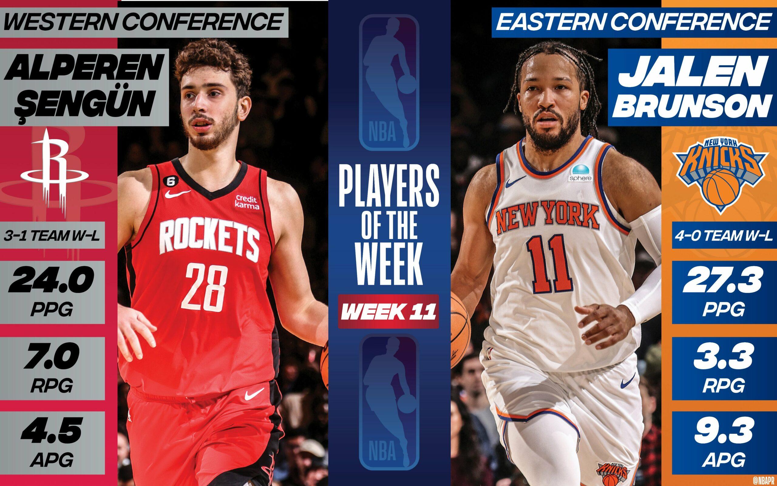 Houston Rockets center Alperen Şengün and New York Knicks guard Jalen Brunson have been named the NBA Western and Eastern Conference Players of the Week, respectively, for Week 11 of the 2023-24 season (Jan. 1-7). pic.twitter.com/Ju11pPewTE
