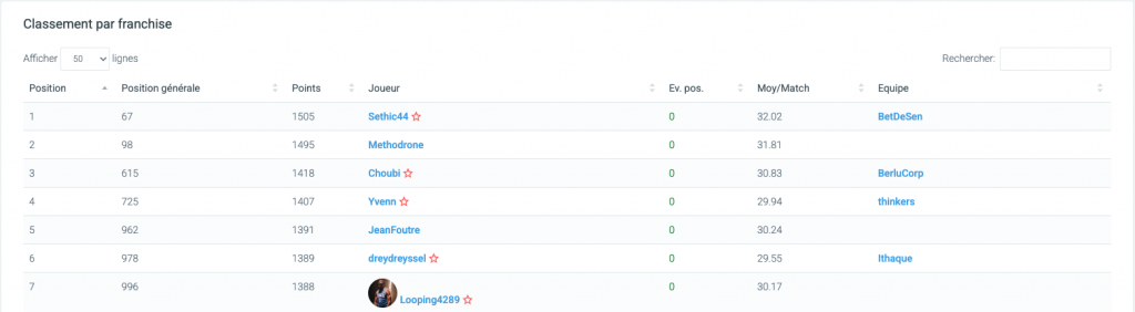 - Joueur : nom et avatar du joueur, clicable pour accéder à sa fiche joueur.