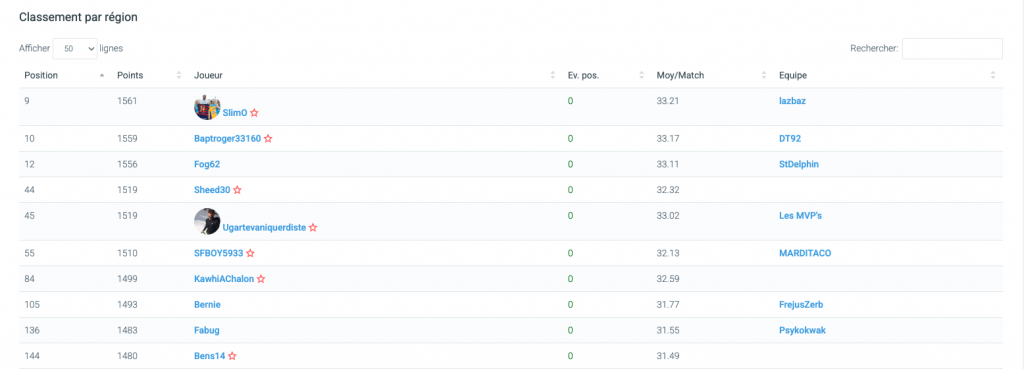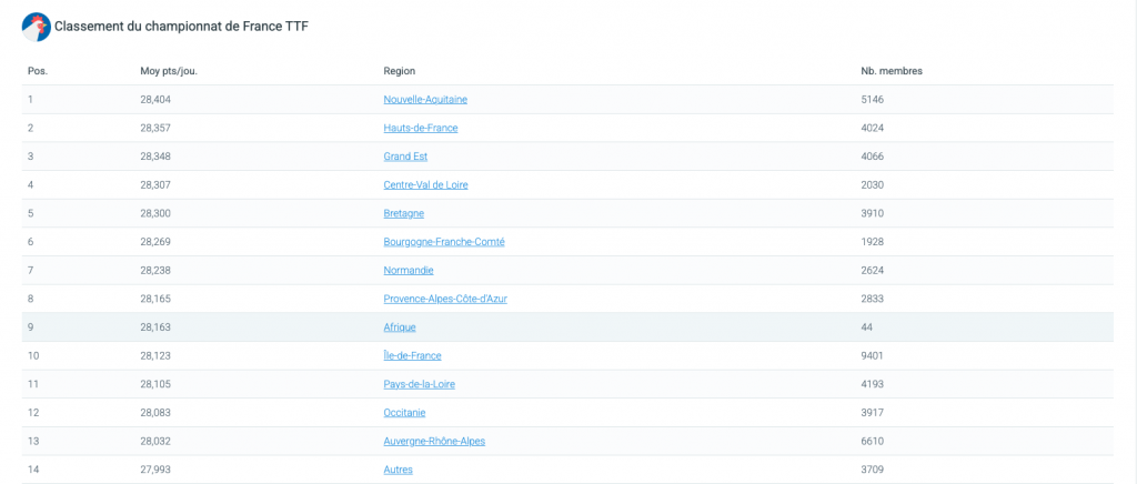 Si les régions s’affrontent, il existe aussi les classements internes. Les informations de ce classement sont les suivantes :